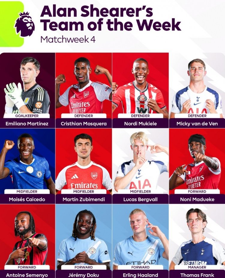 9月16日讯 英超第4轮已经结束了全部的争夺,英格兰足坛名宿希勒评选出了本轮最佳阵,曼城两将哈兰德、多库入选,阿森纳三将苏维门迪、马杜埃凯、莫斯克拉在列。